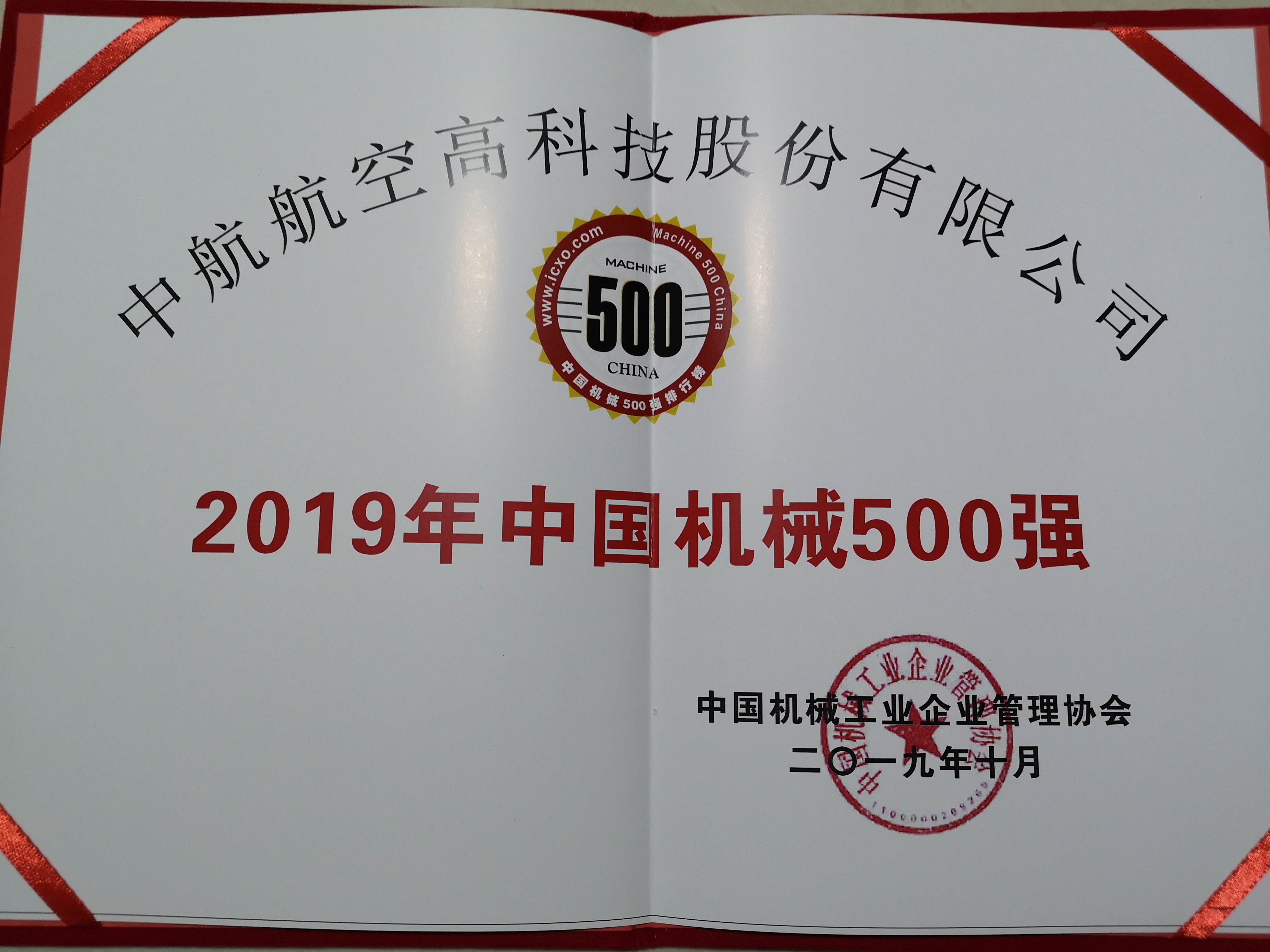 中航高科喜獲“2019中國(guó)機(jī)械工業(yè)500強(qiáng)”榮譽(yù)稱號(hào)